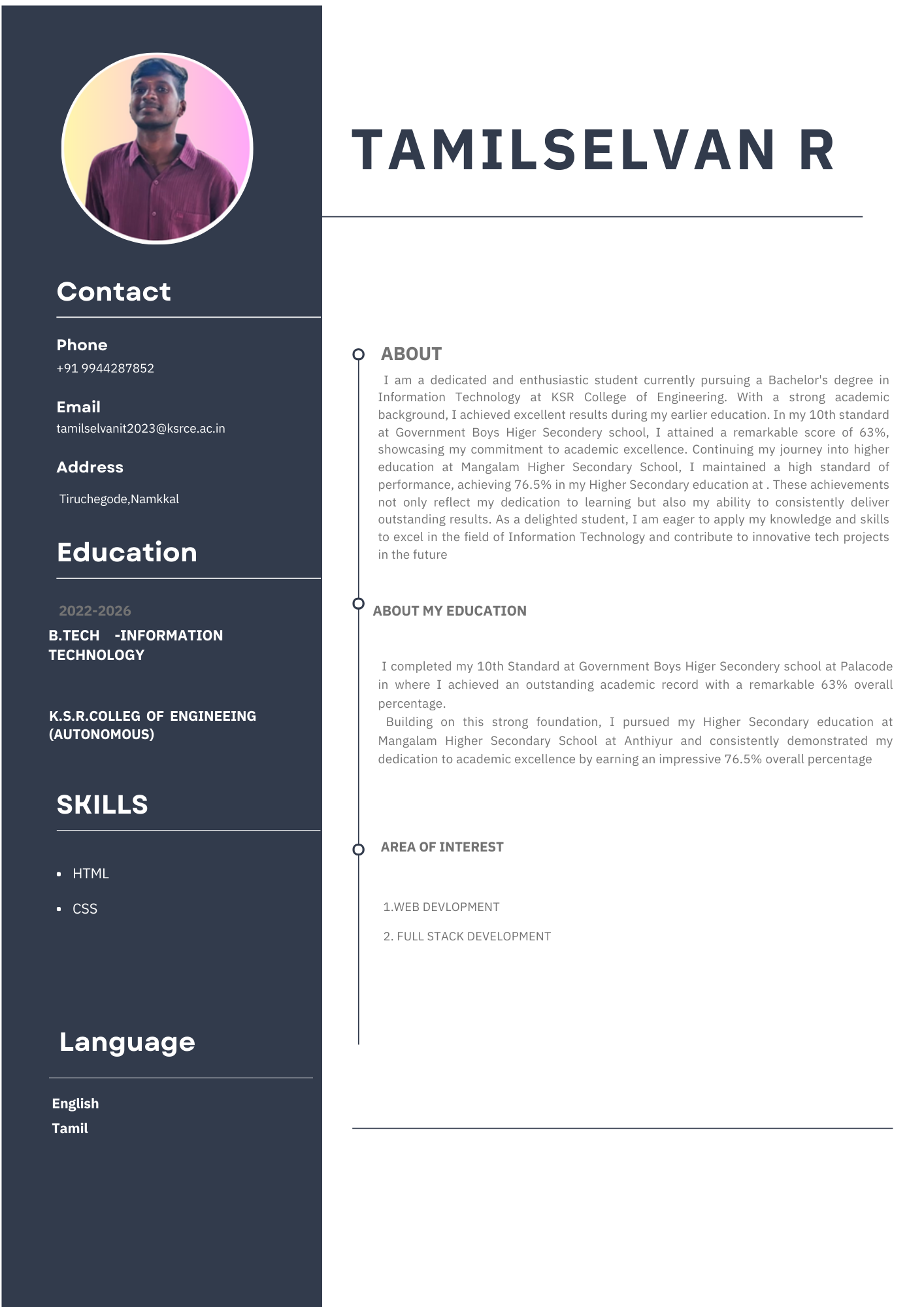 I am a dedicated and enthusiastic student currently pursuing a Bachelor's degree in Information Technology at KSR College of Engineering. With a strong academic background, I have achieved excellent results throughout my earlier. In my 10th standard at Government Boys Higher Secondary School, I attained a remarkable score of 63%, showcasing my commitment to academic excellence. Continuing my educational journey at Mangalam Higher Secondary School, I maintained a high standard of performance, achieving 76.5% in my Higher Secondary education. These achievements not only reflect my dedication to learning but also my ability to consistently deliver outstanding results. As a motivated student, I am eager to apply my knowledge and skills to excel in the field of Information Technology and contribute to innovative tech projects in the future.